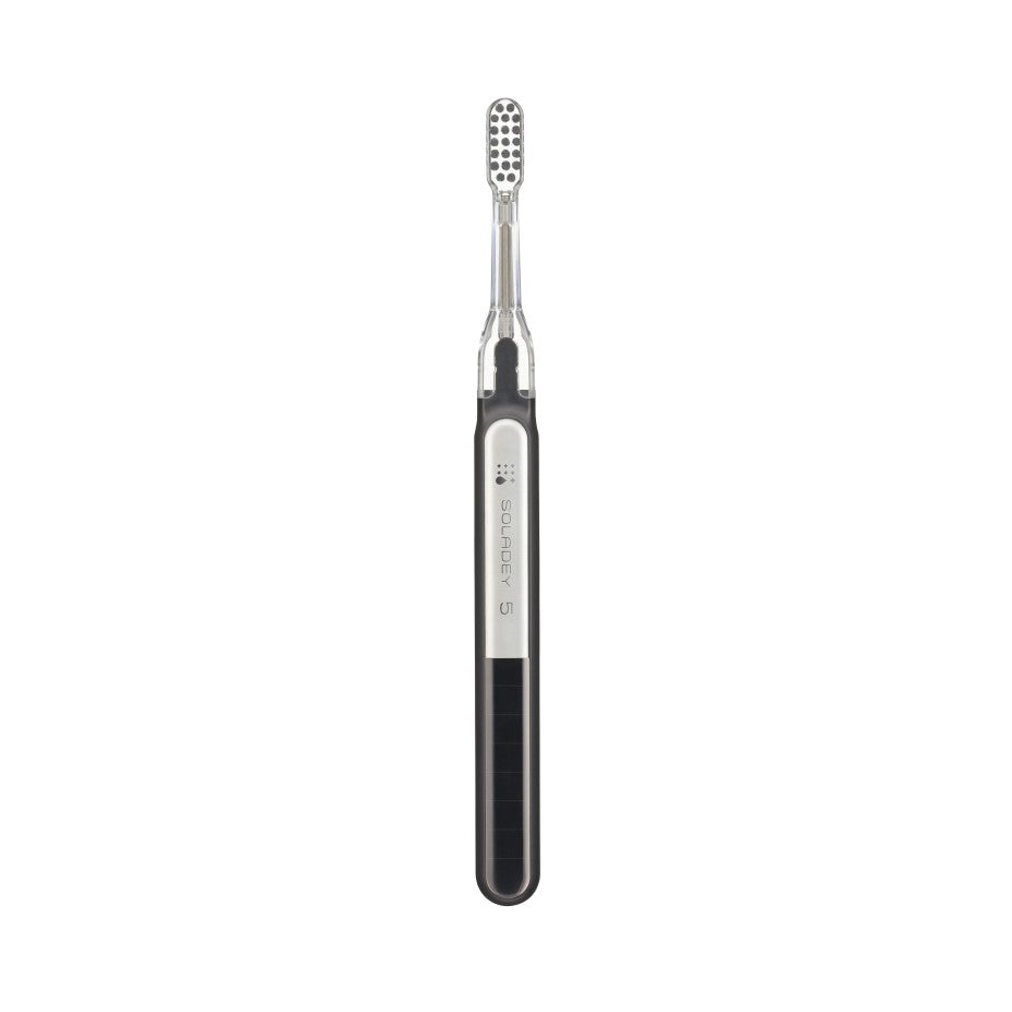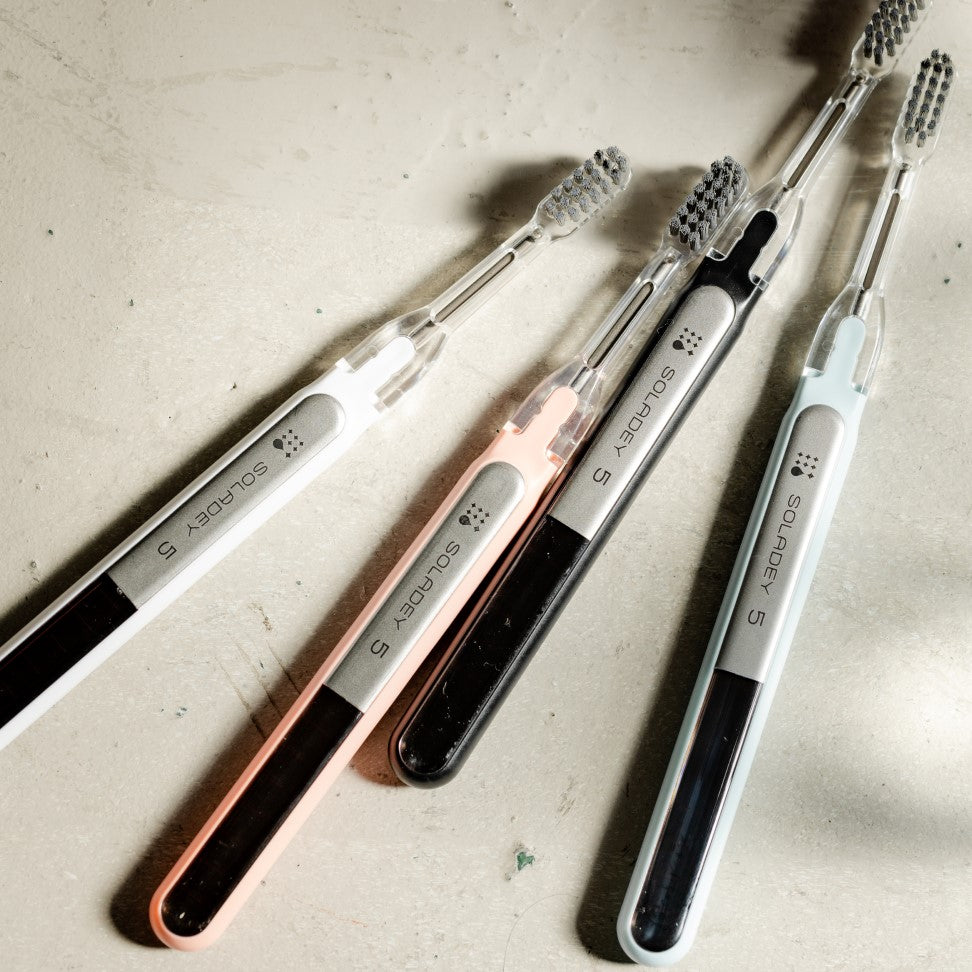 歯ブラシ『SOLADEY5』なら、ブラッシングの際にブラシ部分から『電子(e-)』が放出され、歯のぬめりが取れる取れる。