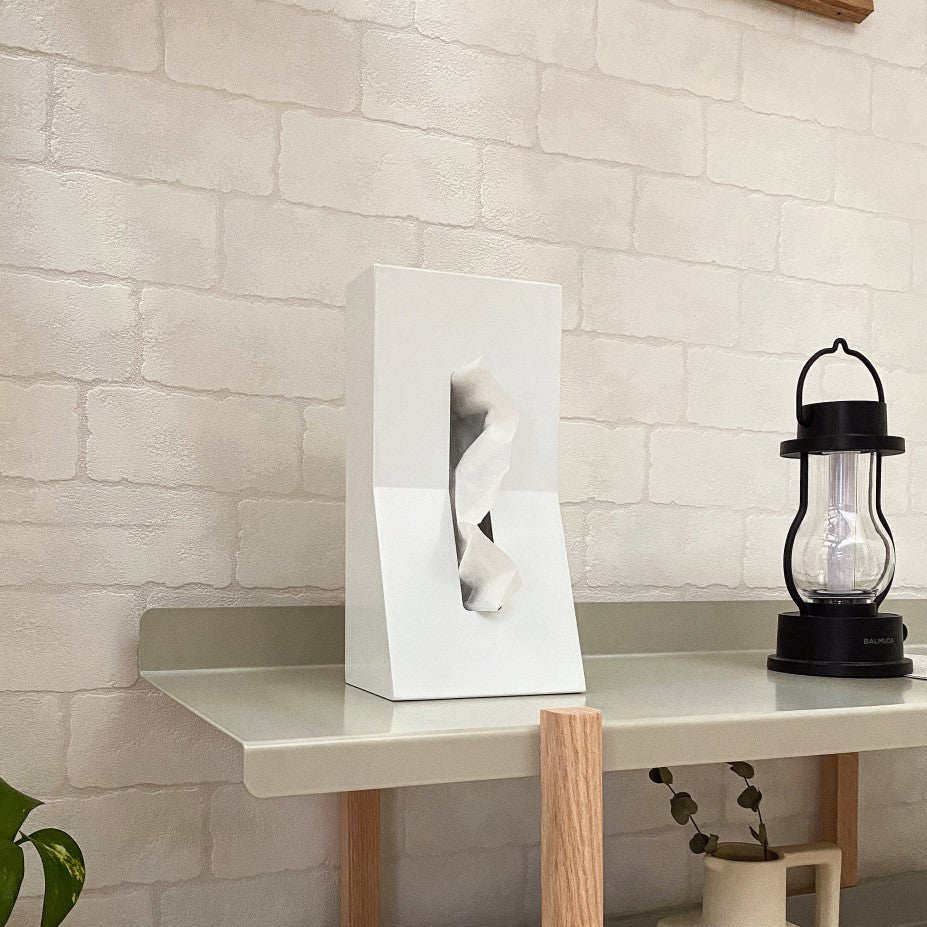 半分から下を手前に拡げたデザインは、インテリアの邪魔をせずに、ティッシュを引き抜く際の転倒を防ぐ機能美を持ちます。